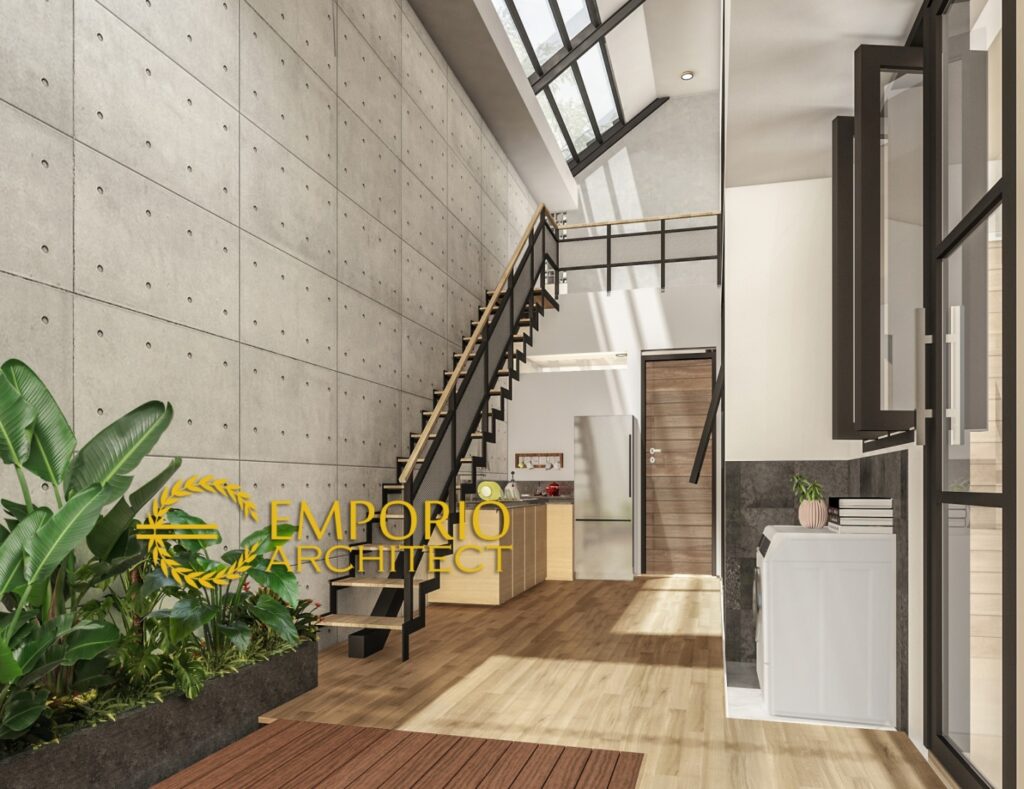 Penggunaan lantai bermotif garis seoerti parquet kayu, dinding beton ekspose, serta rangka atap baja merupakan ciri khas dari konsep industrial. Warna yang mendominasi pada desain ini yaitu warna hitam dan abu-abu.