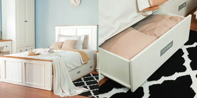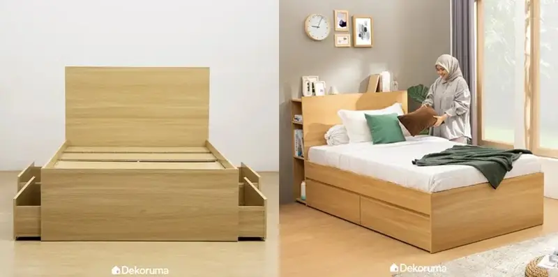 Tempat tidur yang dilengkapi dengan laci penyimpanan di bagian bawah memberikan solusi praktis untuk menyimpan barang. Desain ini cocok untuk anak-anak yang membutuhkan ruang tambahan untuk mainan atau orang dewasa dengan ruang kamar terbatas.