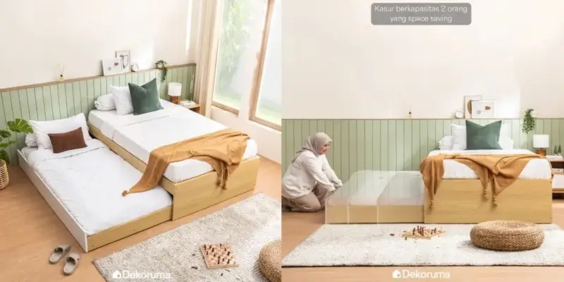 Single bed sorong atau geser sangat cocok untuk kamar tamu atau kamar dengan ruang terbatas. Tempat tidur ini mudah disimpan dan bisa digunakan saat diperlukan. Sebagai rekomendasi ada KATO Divan Tempat Tidur Sorong.
