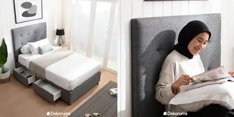 Pilihan ini memberikan kenyamanan ekstra dengan sandaran empuk yang bisa digunakan untuk membaca atau menonton televisi di tempat tidur. Desainnya yang modern cocok untuk remaja hingga orang dewasa.