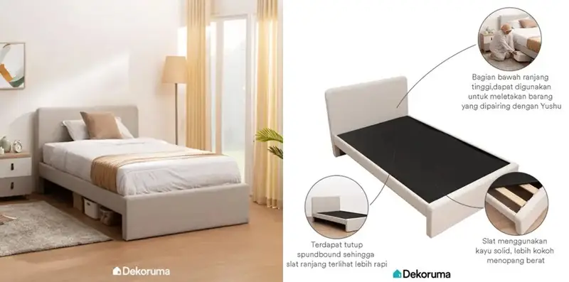 Mengusung desain minimalis dengan warna natural cocok untuk semua tata ruang. Yang menarik, di bagian bawah ranjang tinggi, sehingga dapat digunakan untuk meletakan barang. Selain itu, bagian slat menggunakan kayu solid, lebih kokoh menopang berat dan diberi tutup spunbond sehingga slat ranjang terlihat lebih rapi.