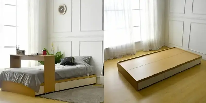 Tempat tidur multifungsi dilengkapi dengan meja adalah desain yang unik dan menarik. Pilihan ini cocok untuk pelajar atau pekerja yang membutuhkan tempat tidur sekaligus area kerja.