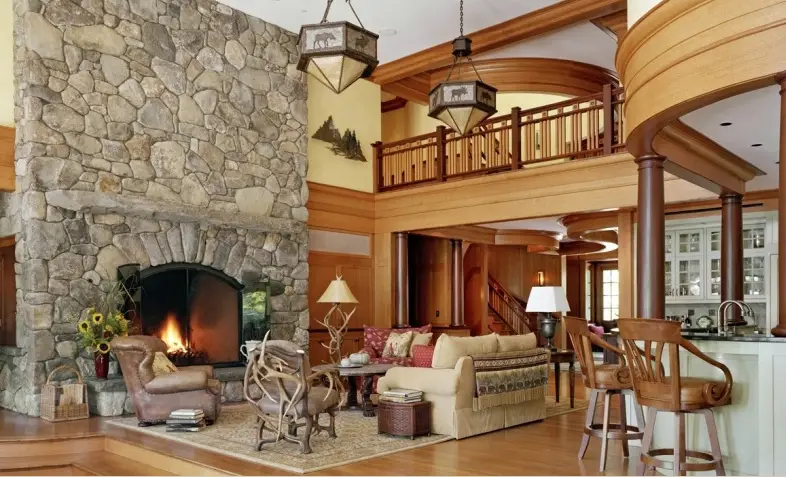 Desain interior rumah rustic identik dengan elemen kayu tanpa sentuhan akhir serta batu alam. Elemen ini bisa dilihat dari dinding bata yang tidak diaci, langit-langit ekspos, dan furniture kayu. Nuansa yang diciptakan oleh desain interior ini adalah kasar namun hangat.