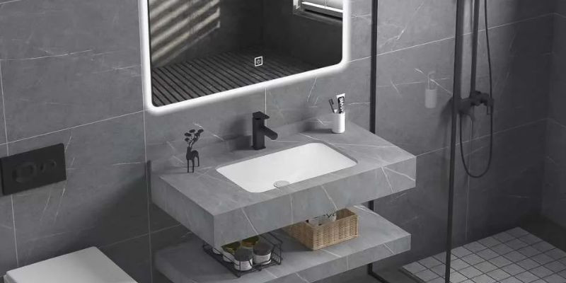 Dengan memilih wastafel berukuran lebar namun tipis, kamu tetap bisa memaksimalkan fungsi tanpa membuat ruang terasa sempit. Wastafel ini biasanya dipasang dengan kabinet gantung dari kayu atau material ringan lainnya untuk menjaga kesan lapang. Untuk memperkuat efek visual, kamu bisa menambahkan cermin berukuran besar atau persegi panjang di atasnya.