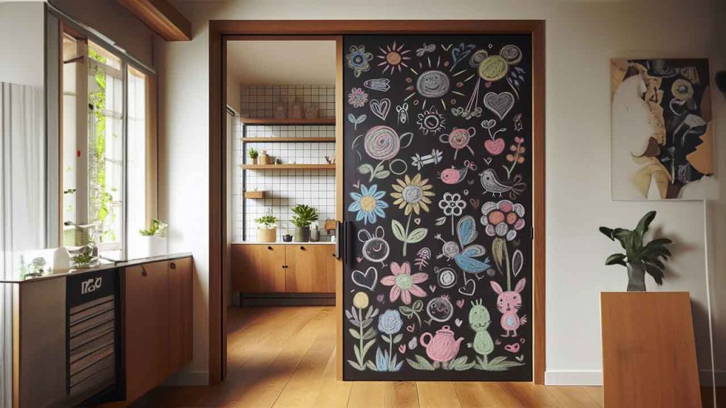 Contoh pintu geser yang satu ini sangat cocok untuk kamu yang memiliki anak kecil di rumah atau hobi mencatat supaya mengingat hal-hal penting. Pintu geser dengan papan tulis ini bisa gunakan sebagai pintu kamar, dapur bahkan ruang keluarga karena cukup fleksibel untuk digunakan pada ruangan manapun.