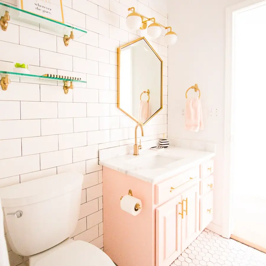 Agar desain keramik kamar mandi ini tidak terlalu sepi, tambahkan kabinet wastafel berwarna pink muda. Beberapa dekorasi dari besi seperti kran air, gantungan tirai, frame cermin, dan lampu juga makin menguatkan kesan industrial yang feminin ini. Desain keramik kamar mandi ini cocok banget untuk anak kamu yang super girly!