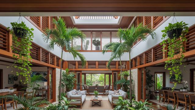 Atrium terbuka adalah ruang terbuka di tengah bangunan yang berfungsi sebagai paru-paru rumah, memungkinkan cahaya alami dan udara segar masuk ke dalam inti bangunan. Desain ini sangat cocok untuk hunian tropis karena memaksimalkan ventilasi dan pencahayaan alami. Atrium atau courtyard adalah elemen desain yang telah lama digunakan dalam arsitektur tropis untuk menciptakan mikroklimat yang lebih sejuk di dalam bangunan, berfungsi sebagai cerobong termal alami.