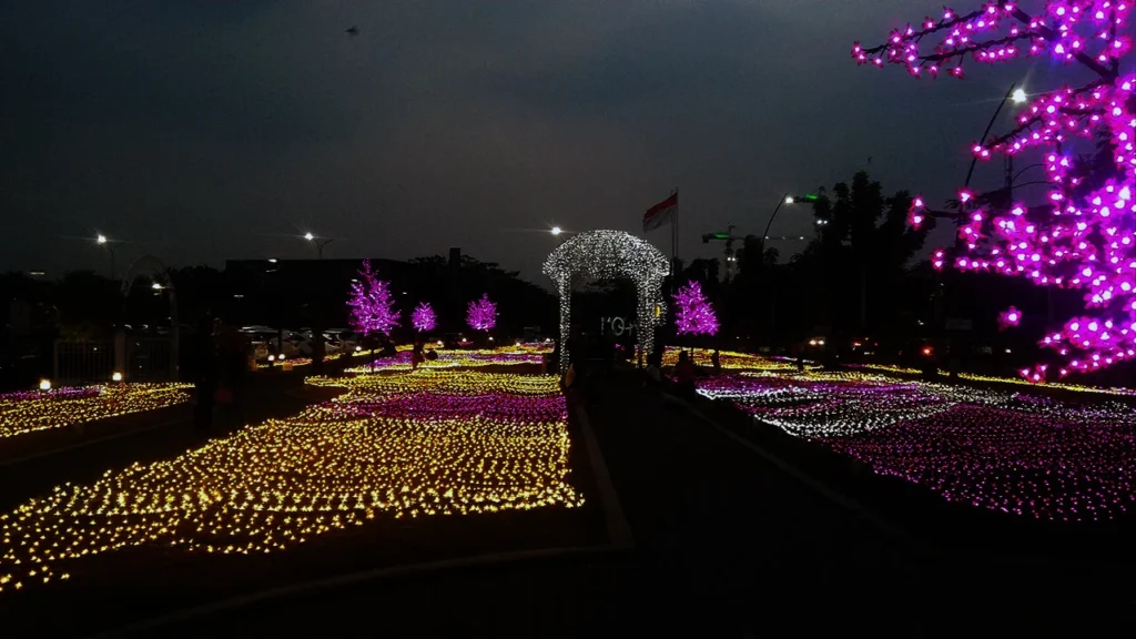 Namun, untuk taman sakura hanya bisa dinikmati mulai dari pukul 5 sore. Karena taman ini disusun oleh lampu warna-warni dan hanya akan terlihat kecantikannya saat menjelang malam.