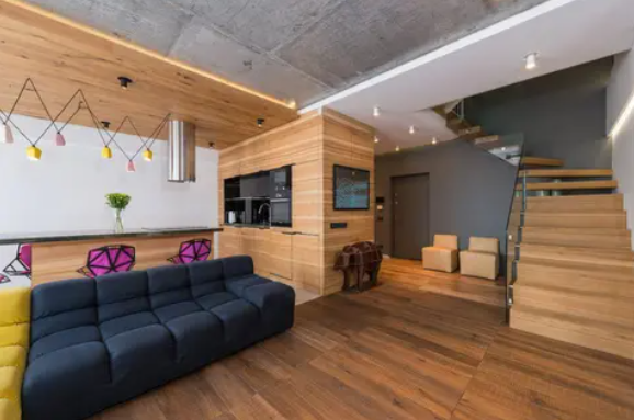2. Ornamen kayu pada bagian tangga, dinding, dan langit-langit memberikan hunian bergaya mezzanine ini tampak begitu minimalis