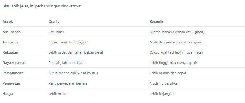 Dari tabel di atas, bisa kelihatan kalau granit unggul di daya tahan dan terlihat mewah, sementara keramik menang di variasi dan harga yang ramah di kantong.