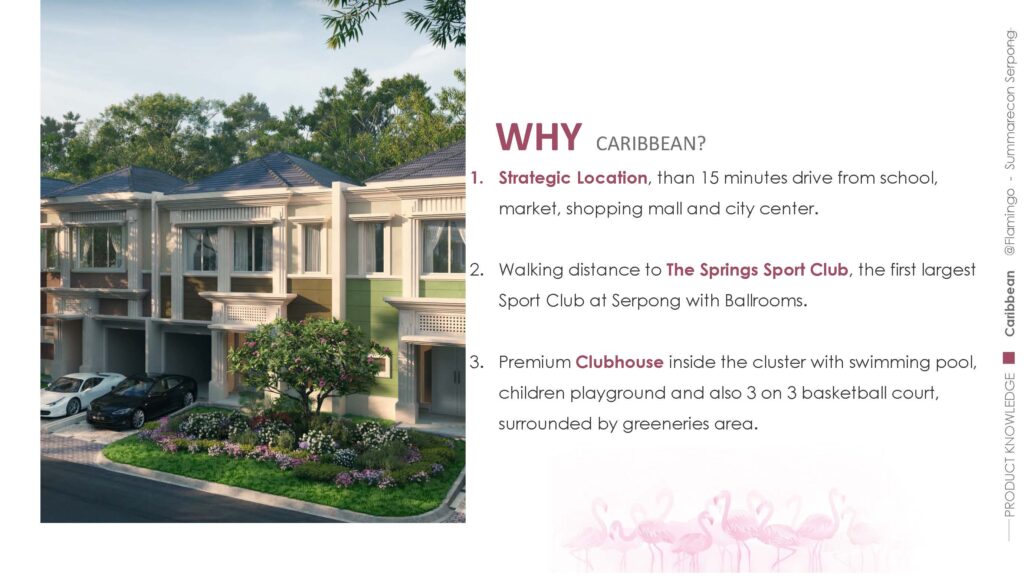 Carribean adalah kawasan hunian mewah yang berada dikawasan Flamingo, Gading Serpong. Dikembangkan oleh Summarecon Serpong, menghadirkan hunian mewah dan premium dengan desain elegan, smart home system dan ROW Jalan yang lebar. Harga mulai dari 2,8 Miliaran!