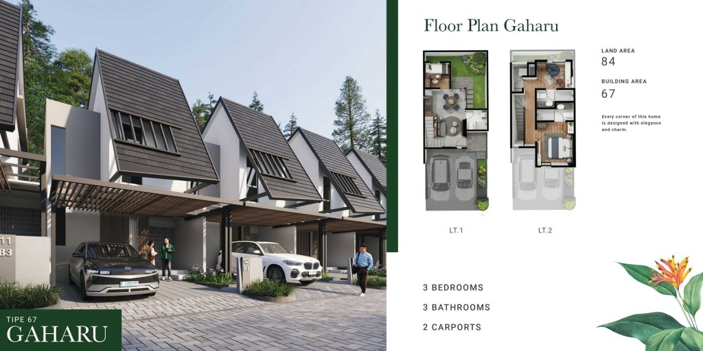Tipe Gaharu hadir dengan konsep dua lantai yang memaksimalkan ruang bagi kenyamanan keluarga. Dengan luas bangunan sekitar 84 m² dan luas tanah 67 m², rumah ini menghadirkan tata ruang yang efisien dan fungsional. Dilengkapi tiga kamar tidur dan tiga kamar mandi, tipe ini cocok untuk keluarga kecil hingga menengah yang membutuhkan hunian nyaman dan praktis.