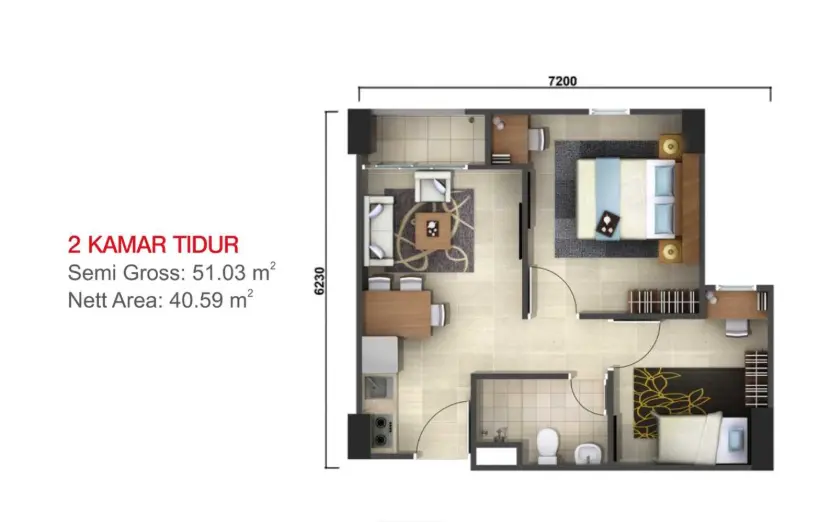 Untuk penghuni yang membutuhkan ruang lebih besar, unit 2 Bedroom (2BR) menawarkan dua kamar tidur dengan luas sekitar semi gross 51,03 m², lengkap dengan balkon serta area bersama yang bisa diatur sebagai ruang keluarga. Unit ini cocok untuk keluarga kecil atau penghuni yang bekerja dari rumah karena menyediakan area yang cukup luas untuk aktivitas bersama dan privasi di masing-masing kamar.