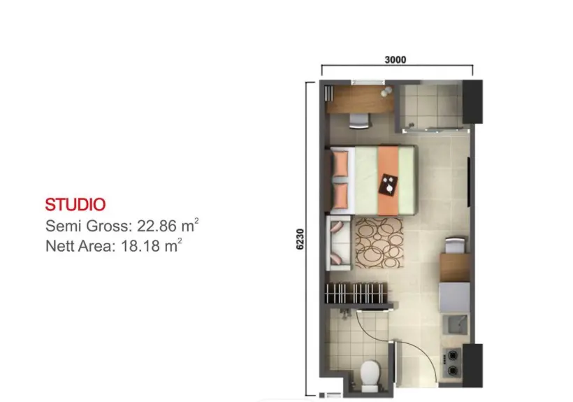 Unit Studio di Akasa Pure Living Tower Kalyana memiliki luas semi gross ±22,86 m², dilengkapi kamar mandi dan balkon yang memaksimalkan sirkulasi udara dan pencahayaan alami. Unit ini ideal untuk penghuni yang menginginkan hunian kompak namun tetap fungsional, cocok bagi lajang, pekerja muda, atau mahasiswa yang membutuhkan ruang pribadi yang efisien dan mudah diatur sesuai gaya hidup mereka.
