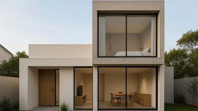 Desain minimalis modern terus menjadi pilihan favorit berkat tampilannya yang bersih dan fungsional. Rumah dengan bagian belakang bertingkat setengah ini menggabungkan elemen kaca besar untuk pencahayaan alami, dipadu dengan struktur beton yang kokoh. Area bertingkat di bagian belakang biasanya dimanfaatkan untuk kamar utama atau ruang kerja yang lebih privat.
