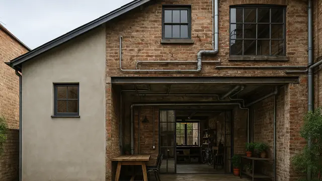 Bagian depan rumah tetap menampilkan kesederhanaan dengan dinding polos dan bukaan jendela yang minimalis. Namun, saat melangkah ke area belakang, nuansa industrial semakin terasa dengan penggunaan pipa-pipa terbuka dan lantai beton ekspos. Area ini sering dimanfaatkan sebagai workshop atau ruang hobi keluarga.