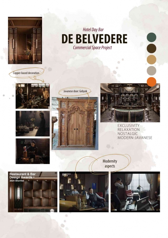 Dalam proyek Interior Design & Styling semester lalu lalu bertajuk “de Belvedere”, penulis merancang interior sebuah hotel bar yang menggabungkan nuansa kolonial Hindia Belanda dengan preferensi estetika generasi modern. Inspirasi utama datang dari drama “Vincenzo”, sebuah serial drama Korea yang menghadirkan cerutu, rokok, dan korek api sebagai simbol status sosial, kekuasaan, dan kedewasaan.Referensi ini kemudian dipadukan dengan semangat lokal dari film “Gadis Kretek”, menciptakan kombinasi antara prestige internasional dan kearifan lokal. Di sinilah kekuatan K-Drama terlihat, ia membuka jalan untuk eksplorasi simbol, suasana, dan identitas lintas budaya dalam satu ruang desain.