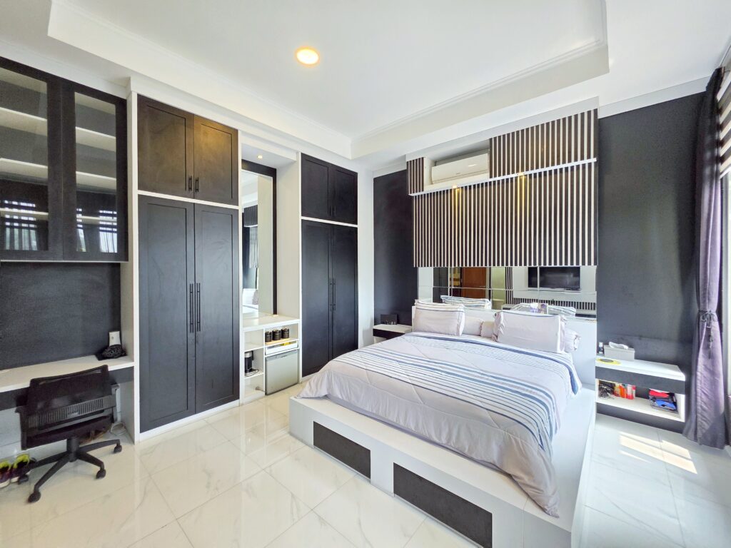 Rumah dua lantai ini memiliki 3 kamar tidur utama plus 2 kamar tambahan yang bisa digunakan untuk kamar pembantu atau ruang kerja. Terdapat juga 3 kamar mandi utama dan 1 kamar mandi tambahan, serta sebuah powder room yang praktis untuk tamu. Dua kamar tidur di lantai atas bahkan dilengkapi dengan balkon yang menghadap ke arah utara, memberikan pemandangan yang asri dan sejuk.