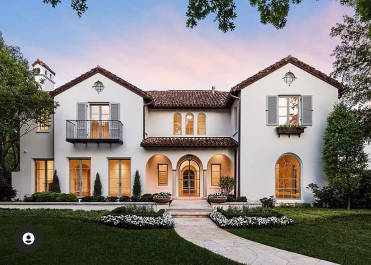 Rumah dengan gaya ini biasanya memiliki teras yang luas, atap genteng, dan jendela serta pintu lengkung besar, memungkinkan banyak cahaya alami masuk ke dalam rumah.