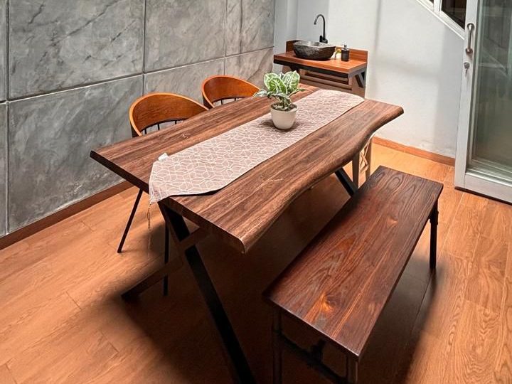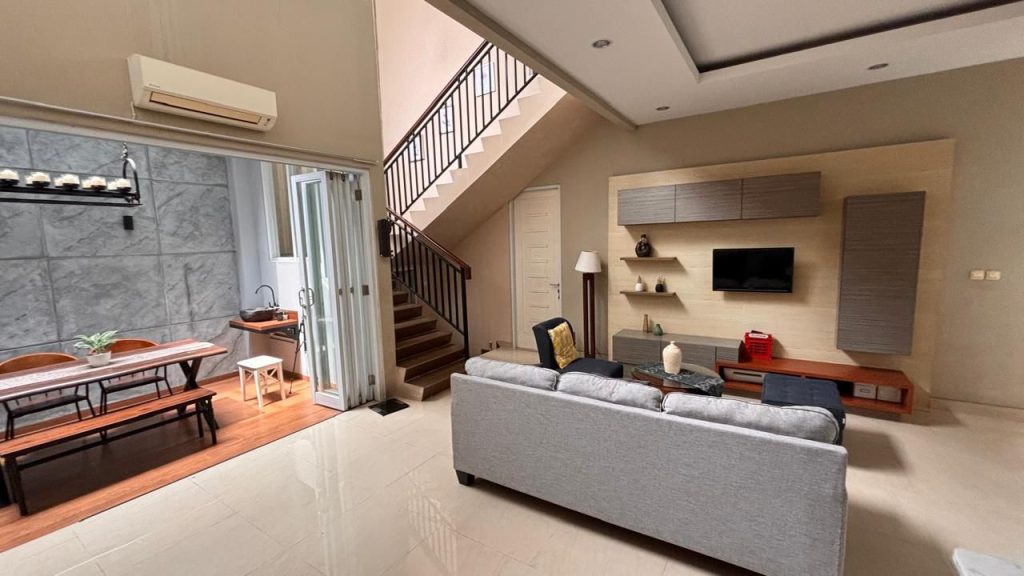 Kenyamanan penghuni semakin terjamin dengan enam unit AC yang sudah terpasang di beberapa ruangan. Tersedia carport yang mampu menampung dua mobil, serta sumber air bersih dari PDAM. Daya listrik sebesar 4400 watt memberikan daya yang cukup untuk kebutuhan rumah tangga modern. Rumah ini dijual dalam kondisi semi furnished, sehingga pembeli dapat langsung menempatinya tanpa perlu banyak renovasi tambahan.