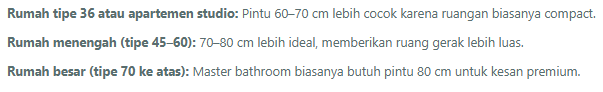 Supaya lebih pas dengan kondisi di Indonesia, kamu bisa sesuaikan ukuran pintu berdasarkan tipe hunian:
